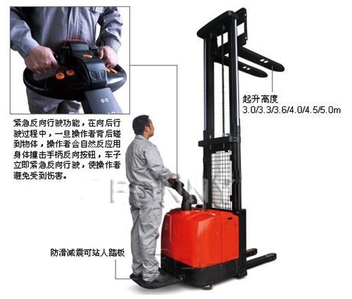 • 緊急反向行駛功能,在向后行駛過(guò)程中,一旦操作者背后碰到物體,操作者會(huì)自然反應(yīng)用身體撞擊手柄反向按鈕,車子立即緊急反向行駛,使操作者避免受到傷害。
