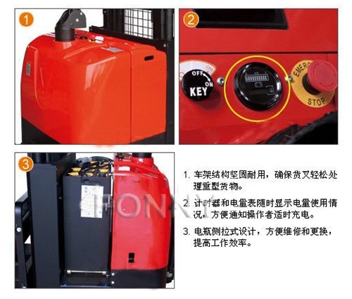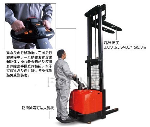 • 緊急反向行駛功能,在向后行駛過程中,一旦操作者背后碰到物體,操作者會(huì)自然反應(yīng)用身體撞擊手柄反向按鈕,車子立即緊急反向行駛,使操作者避免受到傷害。