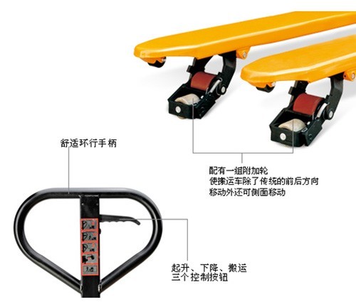 • 配有一組附加輪使搬運(yùn)車除了傳統(tǒng)的前后方向移動(dòng)外還可側(cè)面移動(dòng)