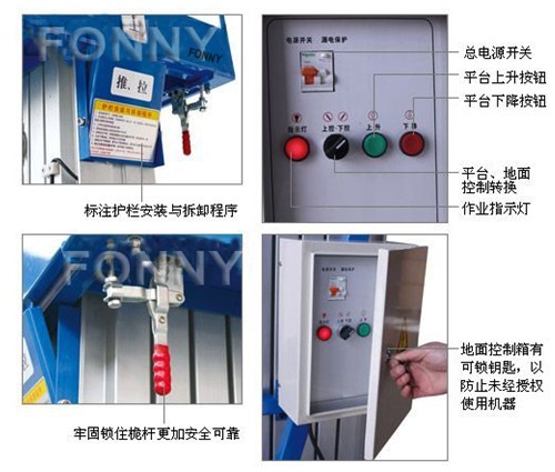 • 緊急下降系統(tǒng):在斷電或其他故障時,可以啟有緊急下降開關,降下平臺。