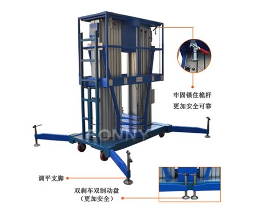 • 兩組桅柱支撐作業(yè)平臺同步升降,具有優(yōu)秀的工作穩(wěn)定性;整體升降式護欄裝置,強度好;