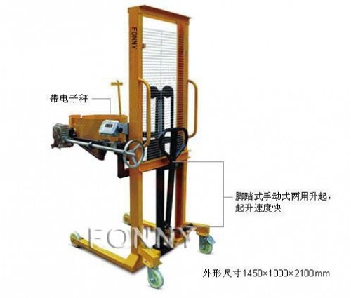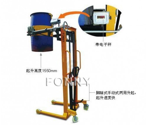 ·帶電子秤稱重式液壓油桶搬運裝卸倒料車,有置零、去皮、稱重功能,精確度可達到±100克;